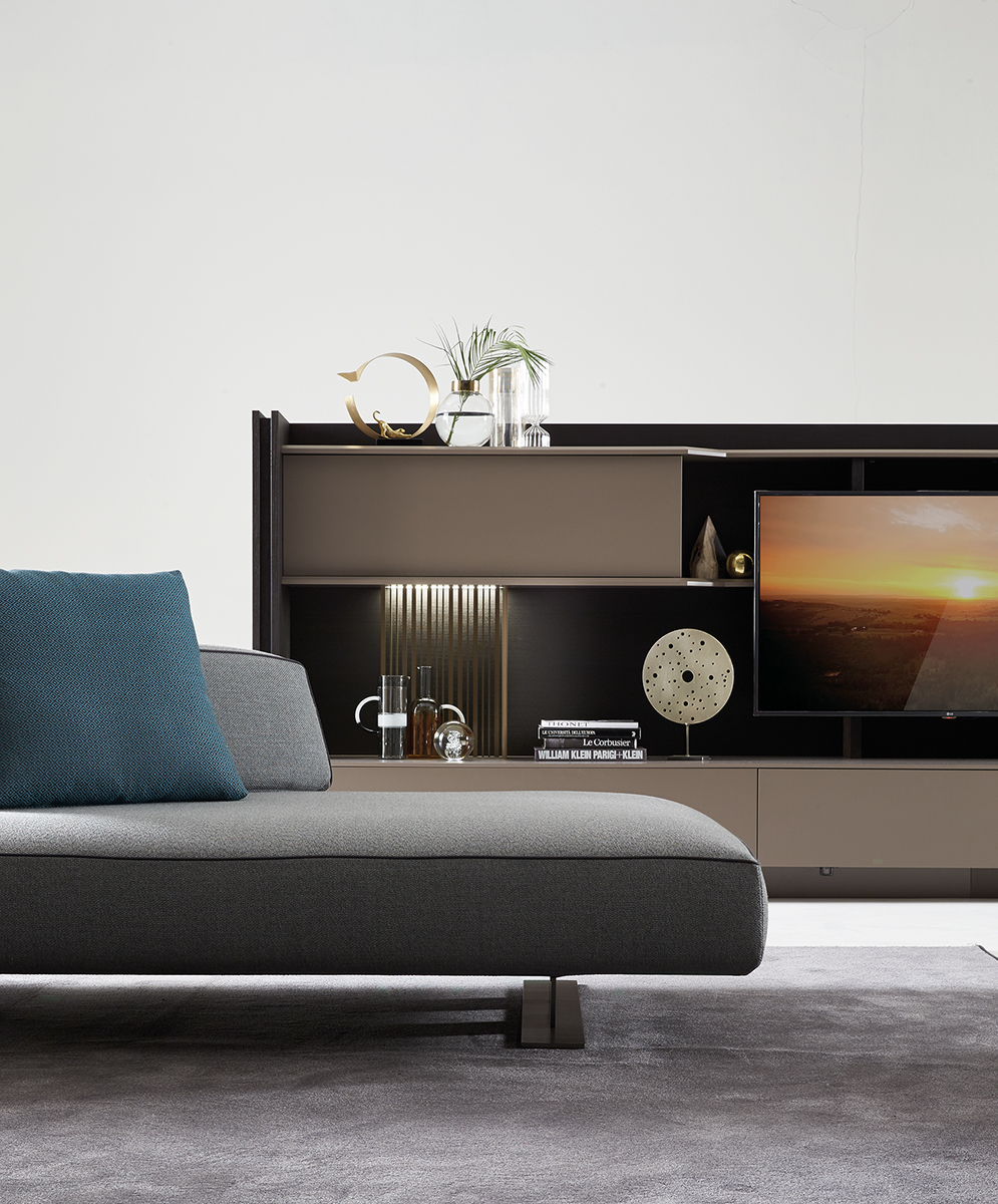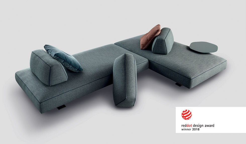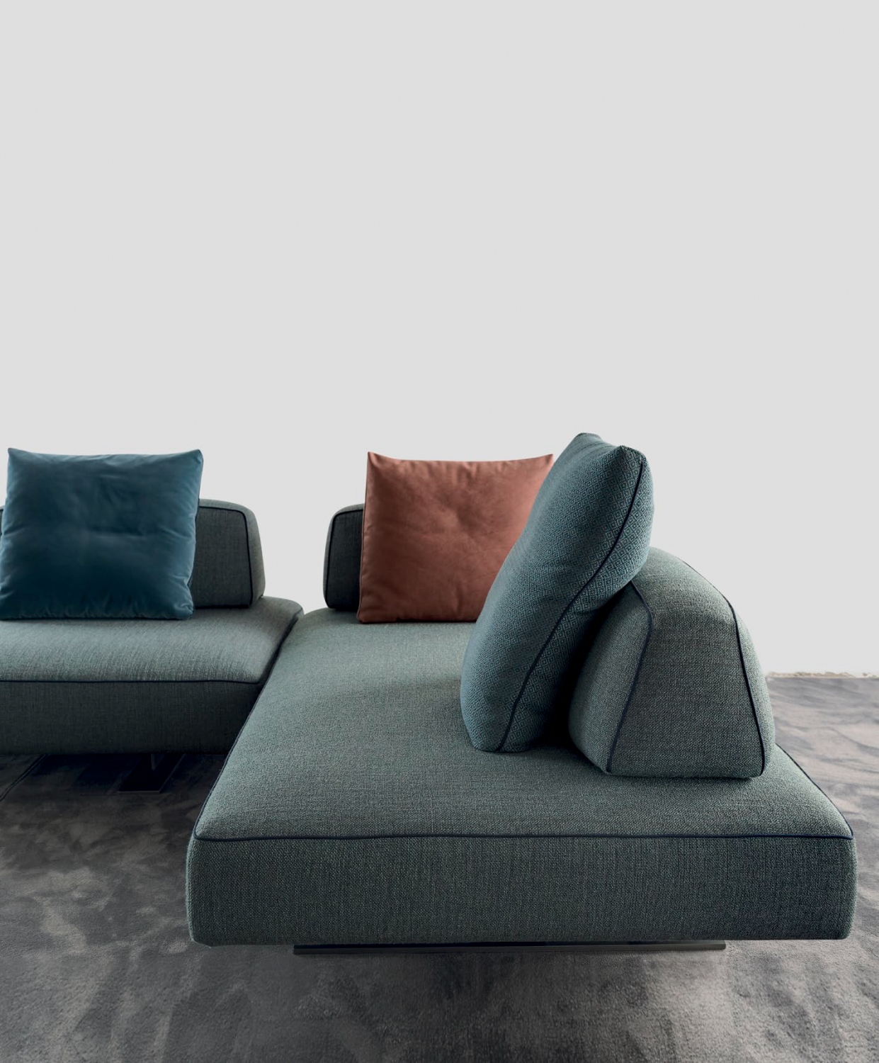 Ses dossiers mobiles glissent librement sur une assise généreuse à l’aspect suspendu, se transformant au gré de vos envies : d’un canapé accueillant à une méridienne double-face.